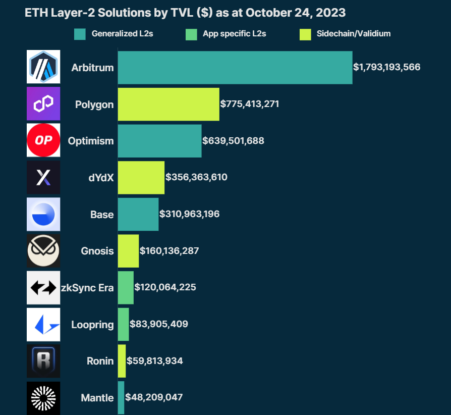 تعتبر Arbitrum (ARB) هي أكبر حل لطبقة-2 ، بقيمة إجمالية مقفلة (TVL) تصل إلى 1.79 مليار دولار في أكتوبر 2023. وصلت إلى ذروتها السنوية من القيمة الإجمالية المقفلة والتي كانت 2.60 مليار دولار في مايو 2023 ، بعد إسقاط رمزها ARB في مارس 2023.