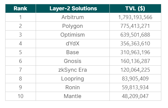 DefiLlama. الحلول العشرة الأولى للطبقة الثانية هي Arbitrum و Polygon و Optimism و dYdX و Base و Gnosis و zkSync Era و Loopring و Ronin و Mantle. الحلول التي تم إطلاقها هذا العام للطبقة الثانية هي zkSync Era و Base و Mantle.